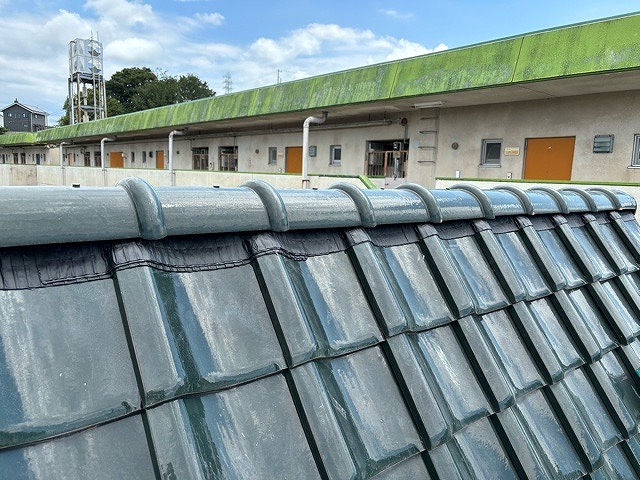 多治見市本町にて突風でアンテナ倒壊→雨漏り発生!緑瓦の急勾配屋根で棟の積み直し工事を実施
