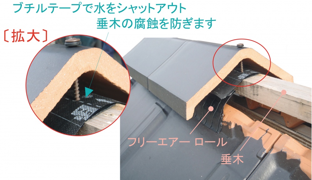 ✔️ フリーエアーロールでの防水+冠瓦の再設置