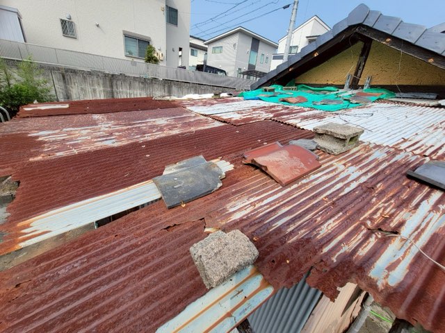 瓦やブロックで応急的に押さえてある状態でしたが、強風や豪雨で吹き飛んでしまう恐れがありました💦