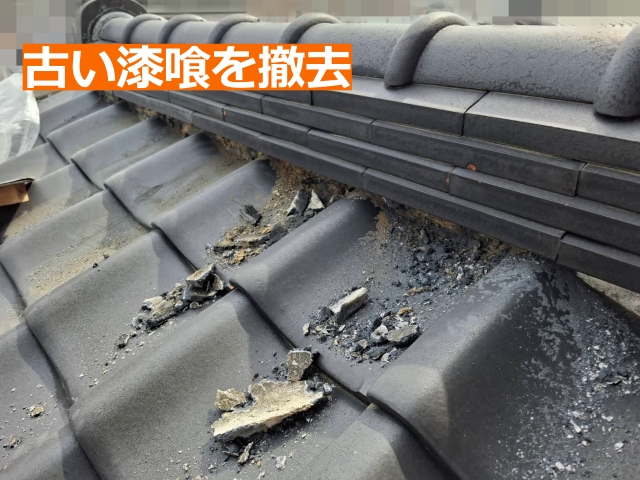 古い漆喰を撤去し、改良型なんばん漆喰「モルロック」を使って詰め直し作業を行います。