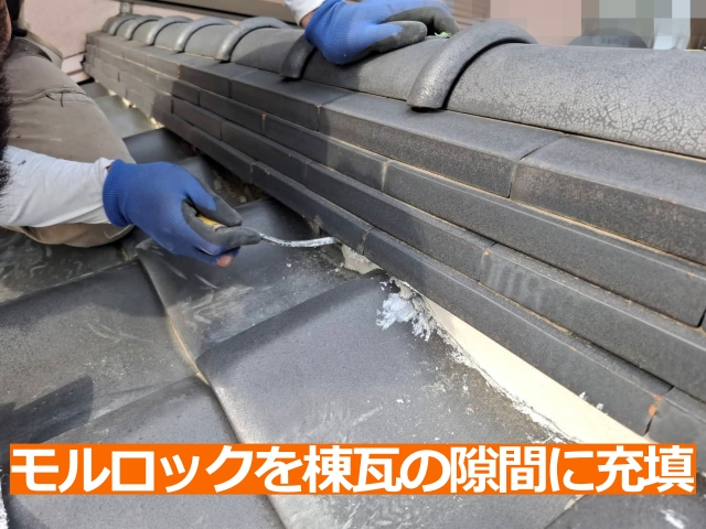 鏝(こて)を使って棟瓦と瓦の隙間にモルロックを押し込むように詰めていきます。