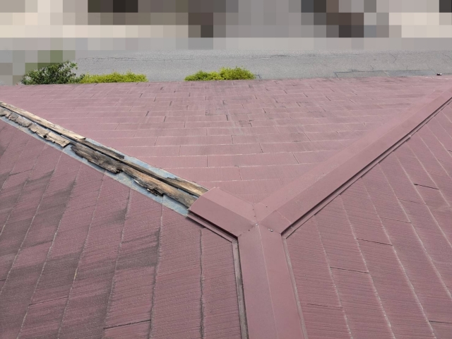 隅棟(すみむね・屋根の斜め方向に伸びている棟部分)の板金の一部が飛散し、内部の下地貫板(ぬきいた)が露出していました。