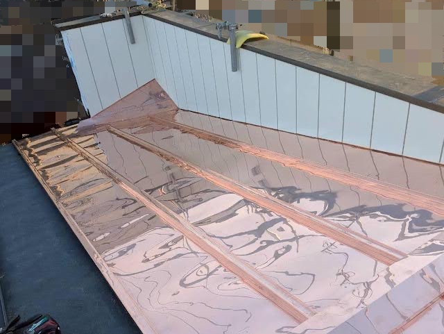 防水紙を敷き終えると、新しい銅板屋根を敷設しました。