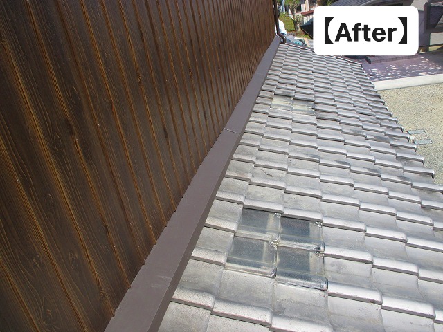 壁際板金と外壁張り替え工事が完了し、屋根と外壁の隙間は完全に解消し雨仕舞も万全な仕上がりとなりました!