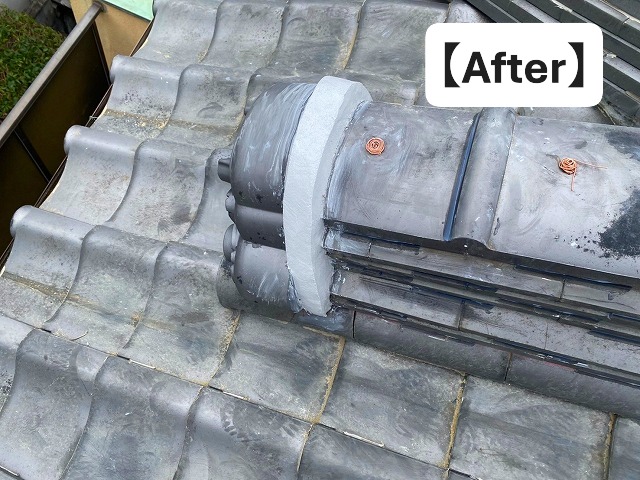 新しい銅線でしっかりと固定し直すことで、台風などの強風時にも冠瓦がズレたり飛散したりするリスクを大きく軽減することができます!