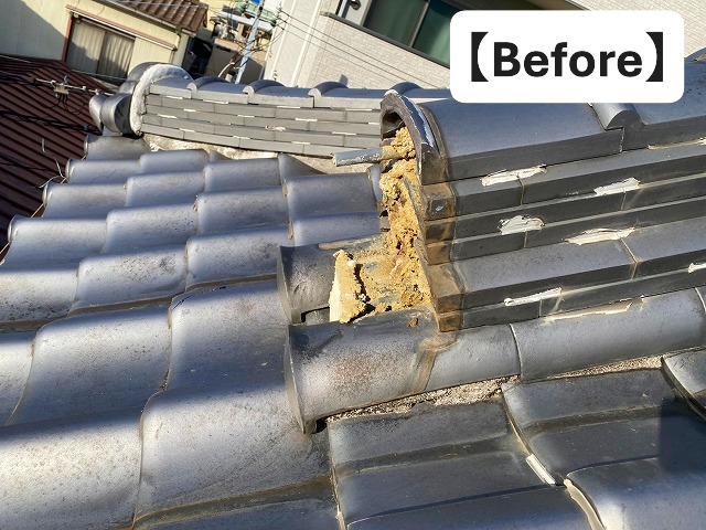 そして今回、根本の原因となったのが、鬼瓦と棟瓦の取り合いにある漆喰の劣化でした。