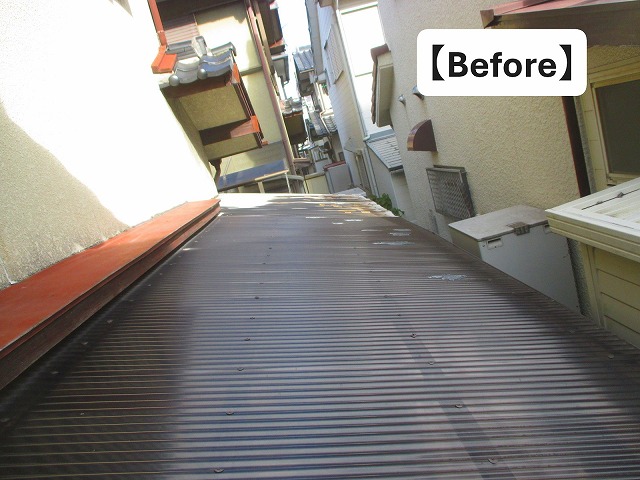 施工後は、波板をブロンズマット色に張り替え、樋も新しいものへ交換。