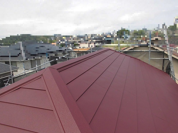 福泉工業㈱の金属屋根材「シルキーG2(ワインレッド)」で施工を行いました。