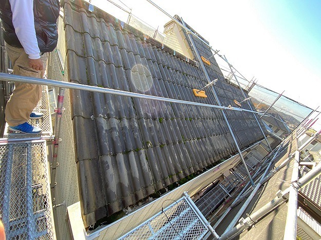 築38年が経過していることもあり、瓦のずれや割れ、棟部のゆがみも見受けられたため、慎重に一枚一枚手作業で取り外していきました。