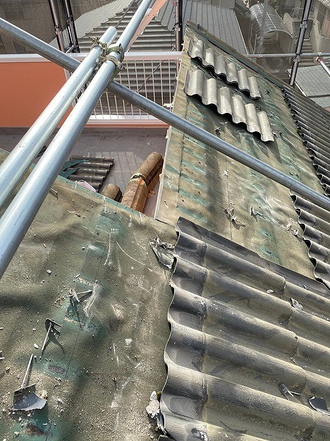 瓦を撤去する際には、破片が飛び散らないよう細心の注意を払う必要があり、また周囲に粉じんが舞わないよう養生をしっかりと施して作業を進めています。
