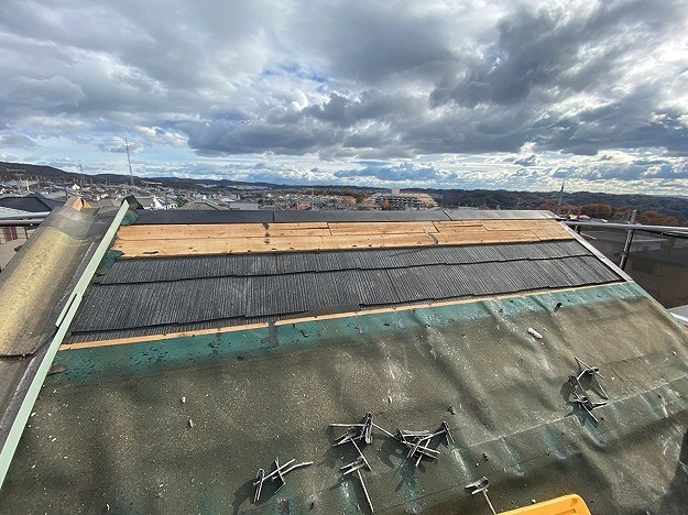瓦の下から現れたのは、既存の防水シートとスレート屋根材です。