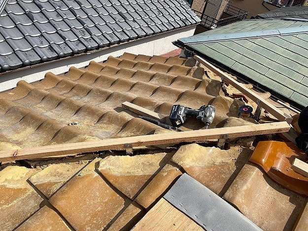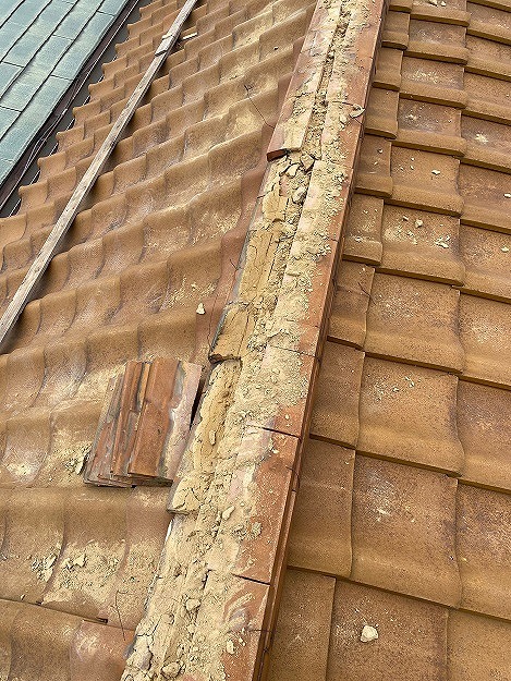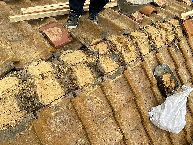 瓦の下にはかつて使用されていた葺き土が見えますが、長年の劣化により風化が進み、ぽろぽろと崩れてしまうような状態でした。
