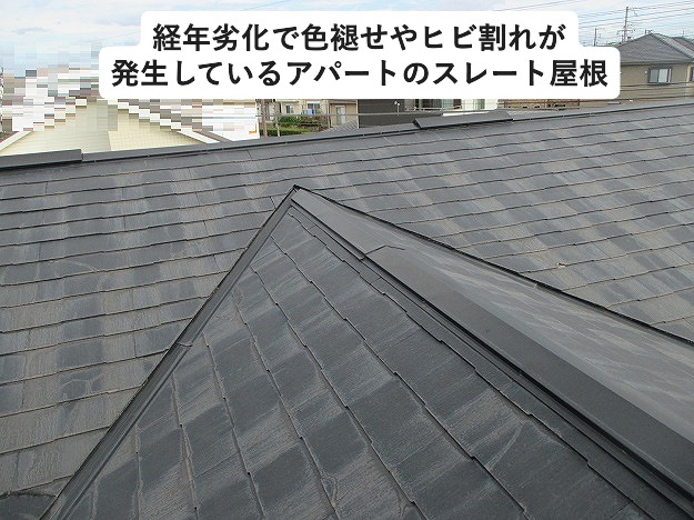 屋根はカラーベスト(以下、スレート)で、経年劣化による色褪せが進み、細かなヒビ割れがあちこちで発生している状態でした。