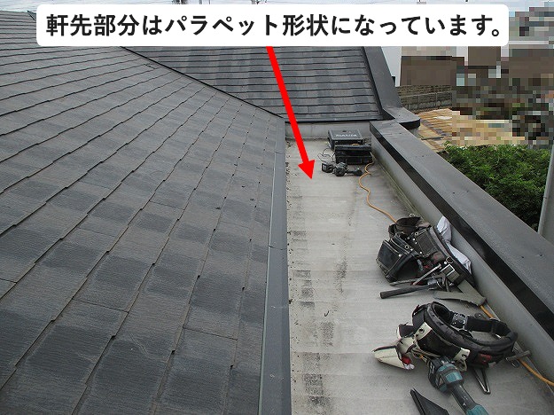また、各軒先箇所は写真の様なパラペット形状で、資材や工具を仮置きできる工事を行いやすい屋根形状でした。