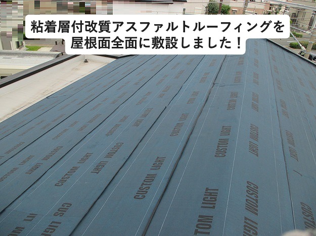 今回は、ロングスパンで安心できる屋根工事をご提供するために、リフォーム工事で使用する改質アスファルトルーフィングの中でも一層防水性を期待できる【粘着層付アスファルトルーフィング】を使用しました!