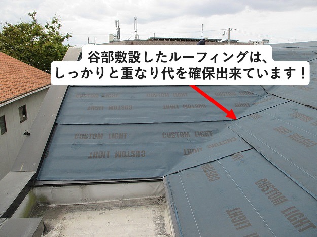 防水紙敷設が完了した後は、新設屋根材施工に備え、新しい谷板金を取付けします。