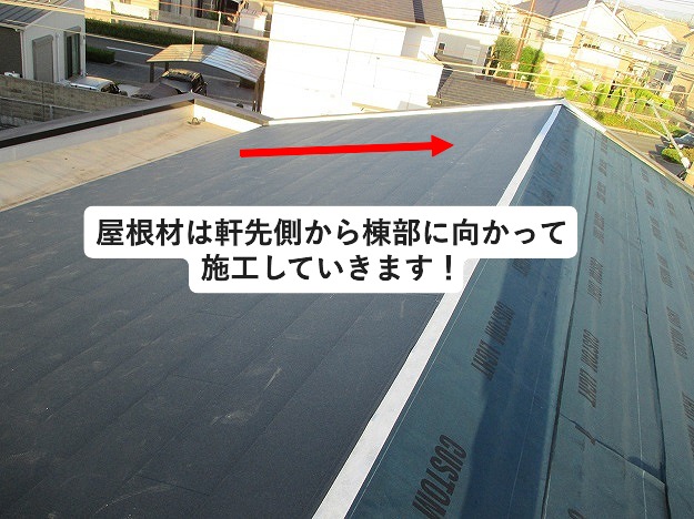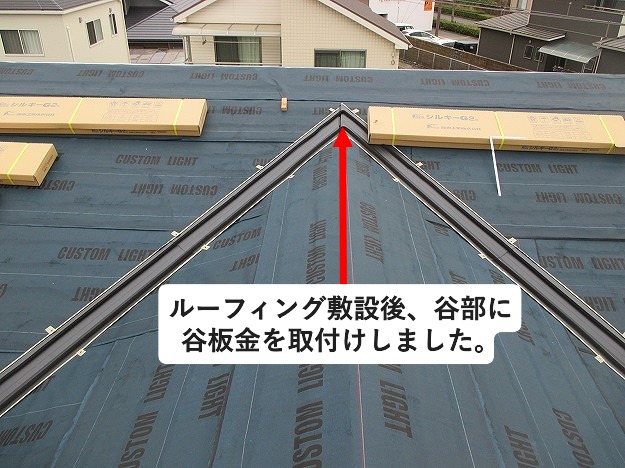 谷板金等の部材取付けが完了すれば、いよいよ屋根材の施工に進んで行きます。