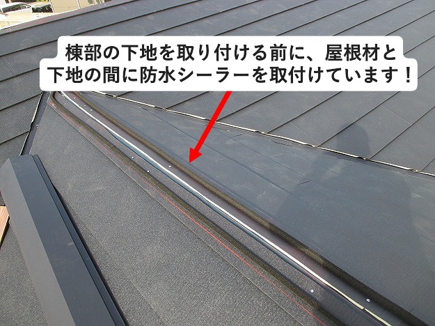 棟部には新しい下地を取付け棟包板金を被せていきますが、下地取付け前に屋根材と下地の間に防水シーラーを仕込んでおきます。