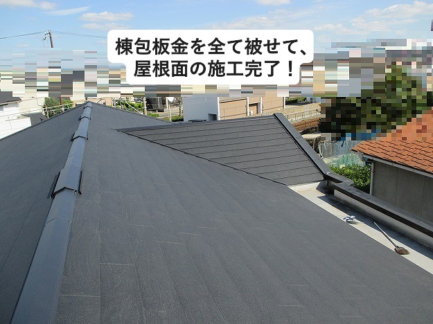 棟部に換気棟および棟包板金を被せて屋根面の施工が完了となります!