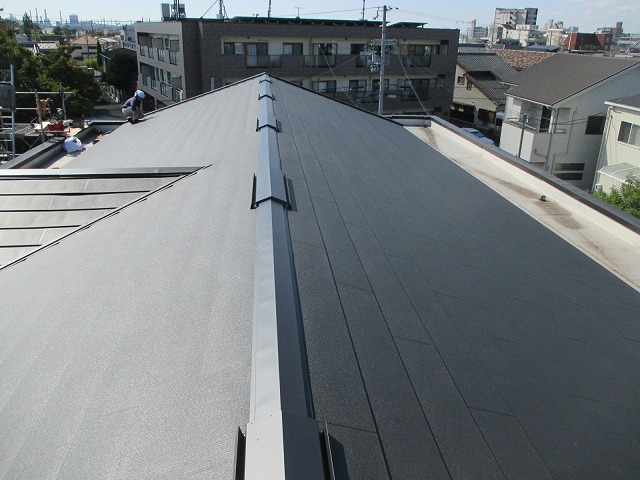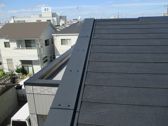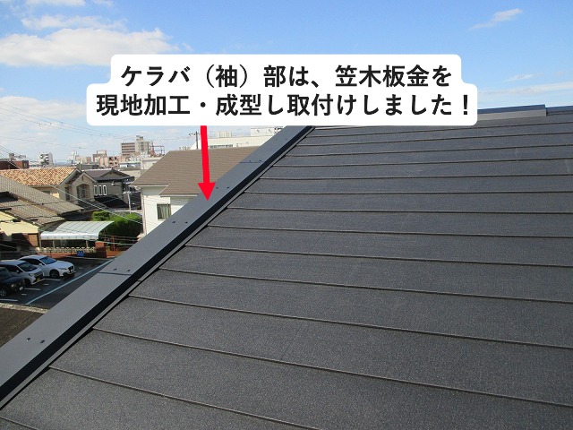 こちらの屋根面はケラバ(袖)部が笠木形状となっていたため、屋根材と笠木との接点は新しく笠木板金を被せて納めました。