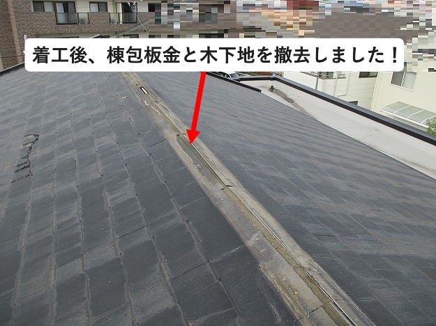 着工後、まず、棟部分の棟包板金と内部の木下地を撤去します。