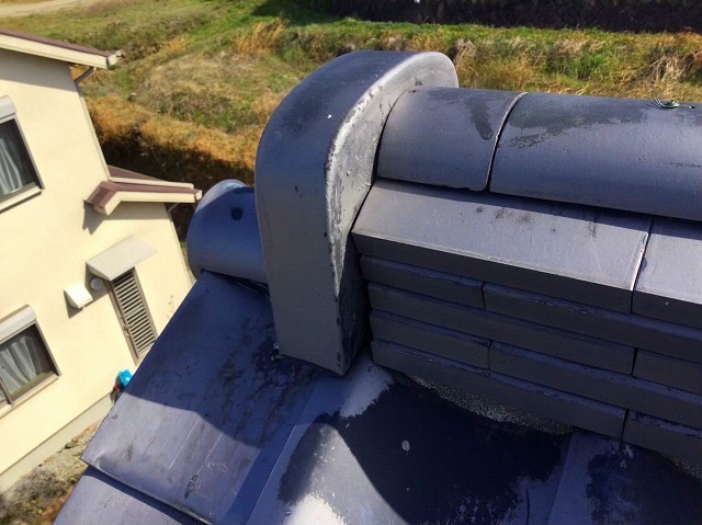 調査したところ、熨斗瓦の勾配不良と漆喰面戸の出過ぎが原因と判明し、強雨や横殴りの雨で棟内部へ浸水していました。