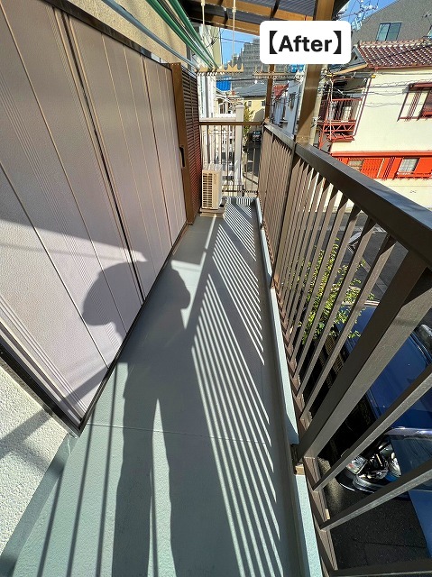 すべての工程が完了し、グレー色の美しい防水塗膜で仕上がったベランダがこちら。