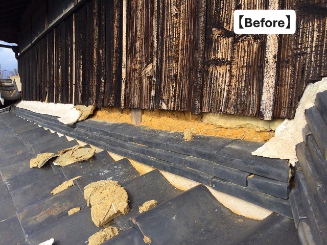 今回は、その様な古民家にて外壁と瓦屋根の壁際部分に施工されている漆喰の剥がれ が問題となっていました。