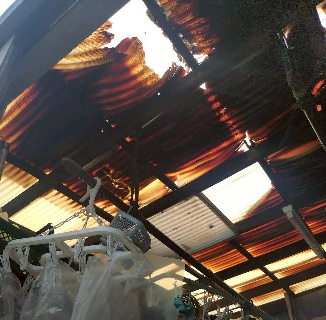 外壁に沿って設けられた物干し兼収納スペースは日常的に使用されていましたが、ポリカ波板屋根に多数の穴あきが見られます。