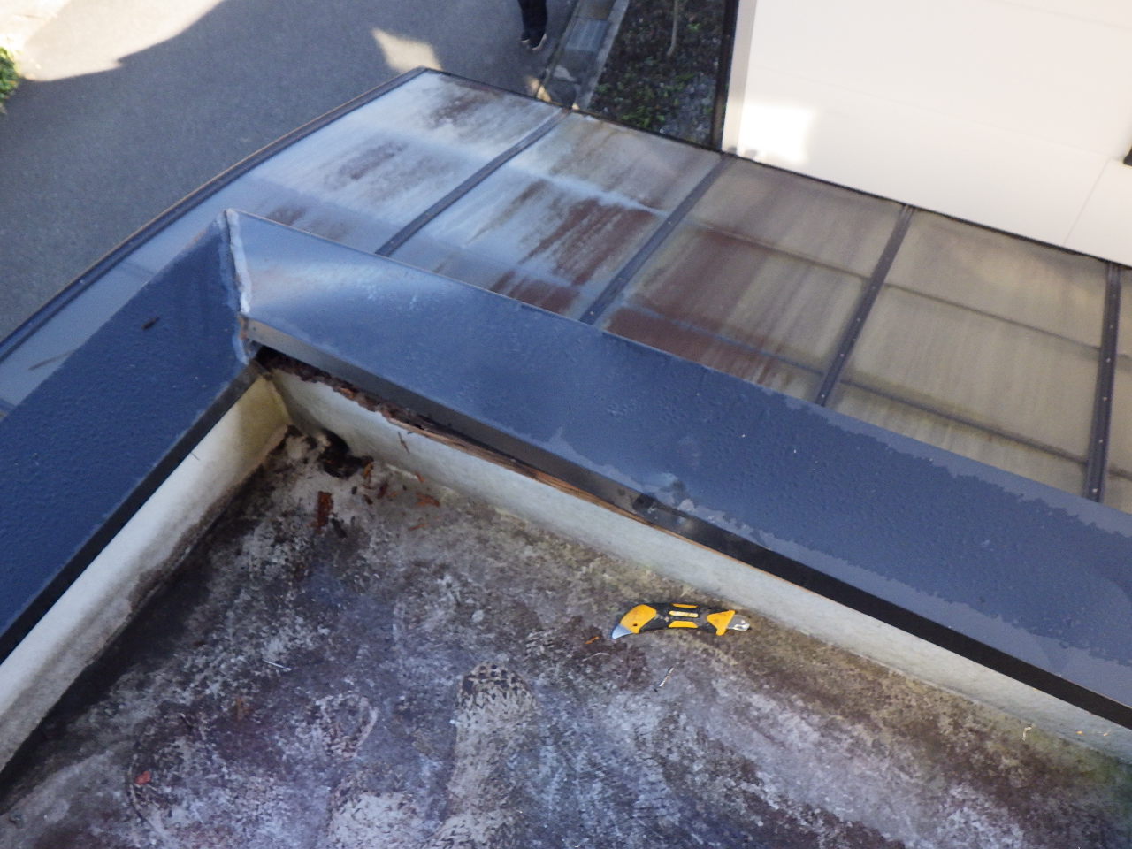 調査写真では、笠木の継ぎ目付近に隙間ができ、内部の木材が露出していました。表面の金属部分は一見すると問題がなさそうでも、内部で傷みが進んでいることは少なくありません。実際、笠木直下の防水層には汚れと劣化が見られ、雨水が滞留しやすい状態でした。職人も指で軽く触れるだけで木屑が落ちるほどで、腐食の進行がうかがえる状況でした。