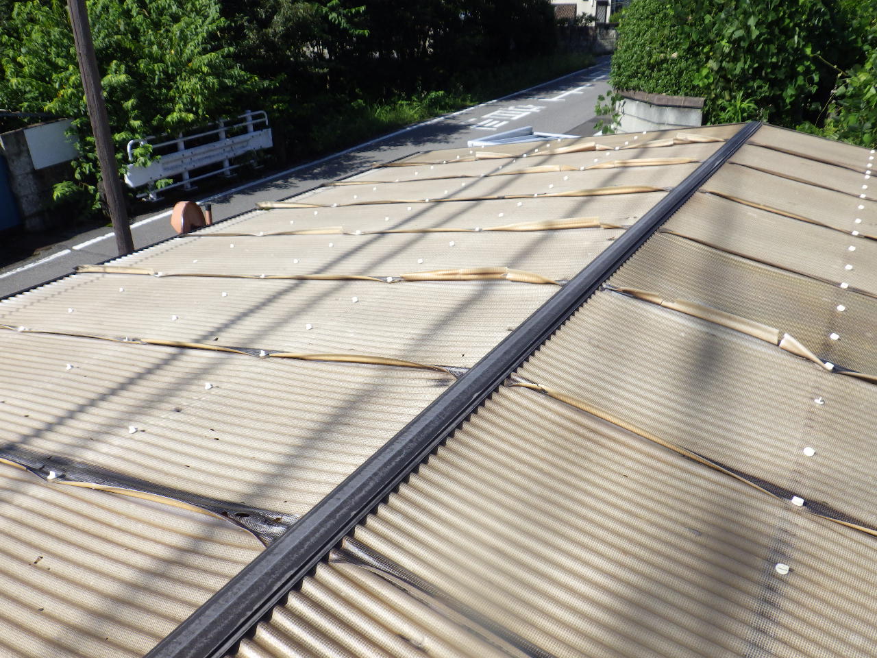 最後の調査写真では、波板の重ね合わせ部分の隙間が広がっていました。ここから雨水が侵入しやすくなるため、見逃せない劣化ポイントです。屋根材全体が紫外線や風雨の影響を強く受けていたことがよくわかる結果となりました。