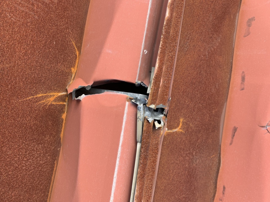 現地調査では、屋根の一部が大きく折れ曲がり、屋根材が剥がれてしまっている状態でした。