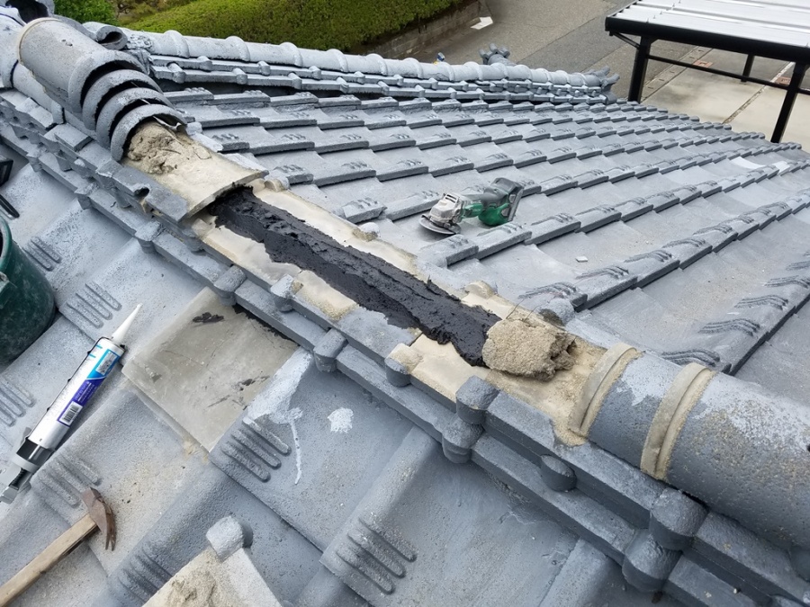 こちらの写真では、棟瓦を取り外し、内部のモルタルや土が見える状態になっています。