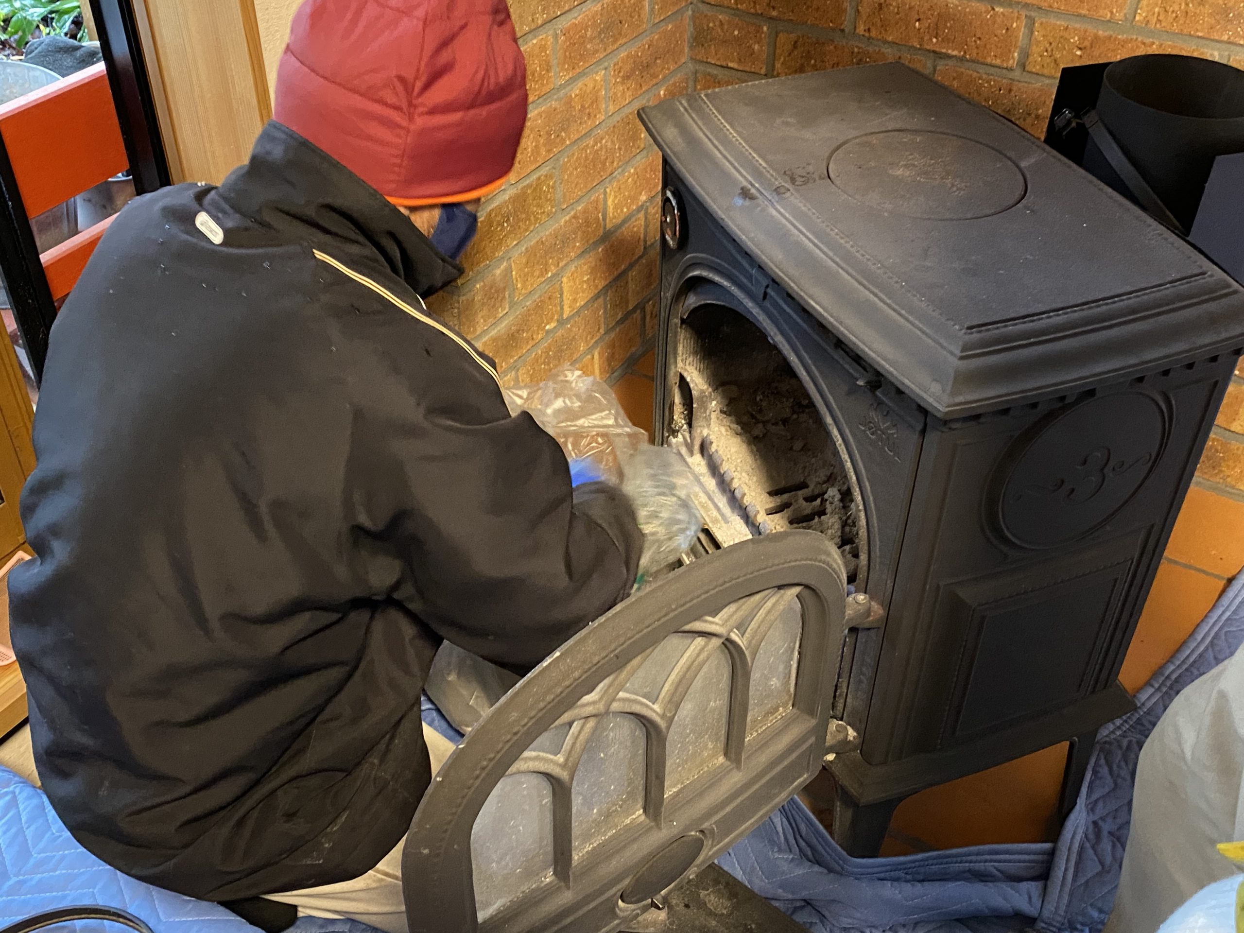 職人が薪ストーブの扉を開け、内部に溜まった灰や煤を丁寧に取り除く作業を進めています。