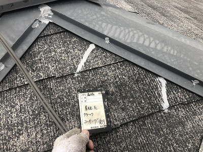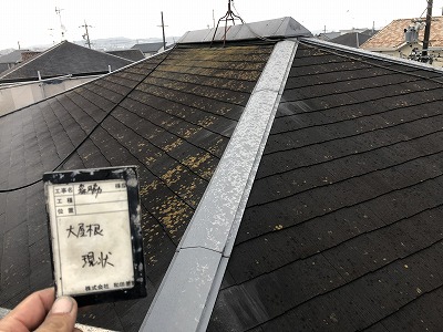 現場調査の際大屋根全体にカビやクラックなどが確認されました、カビや苔に関してスレート屋根(カラーベスト)カビや苔などは屋根に雨が残り、湿気などで発生します。クラック(ひび割れ)にかんして