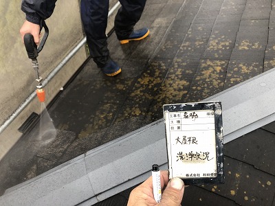 今回のスレート屋根塗装をいたしました、お客様にもかなり喜んでもらい弊社も嬉しかったです、屋根塗装の仕上がりや耐久性を左右する「高圧洗浄」は、見えないけれどとても大切な下準備です。