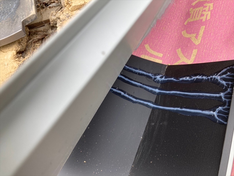 ガルバを重ねるので隙間にコーキングで固定して(さらに隙間も防水対策します)左右の周りもビスで固定します