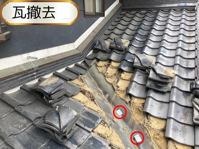 劣化した谷板金の撤去の前に周囲の瓦を一旦撤去します、谷板金の白いテープを貼っているのは銅板に穴が開いているので現場調査の際のテープで穴を仮補修いたしました、谷板金を外し裏面を見てびっくり!酸化していますね。銅板の隙間から雨水が進入し変色したと考えれます。
