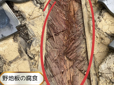 銅板を外し野地板は腐食していますね、穴あきなどはありません、本来は板金の下に防水紙を引くのですがこのお家はかなり築年40年以上なのでこの頃の設計は防水に向けて建てられてないため、野地板まで雨水が進入して雨漏りが発生した感じになります。