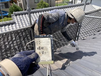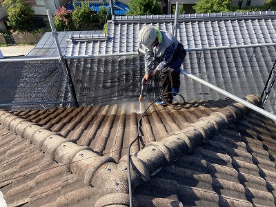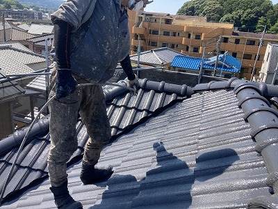 下塗りで全体を吹き付けした場合は仕上げの吹き付けに進みます!上塗り用マイルトを使い全体に吹き付けしていきます!瓦の隙間などすべて隅々まで耐久性をあげていきます!