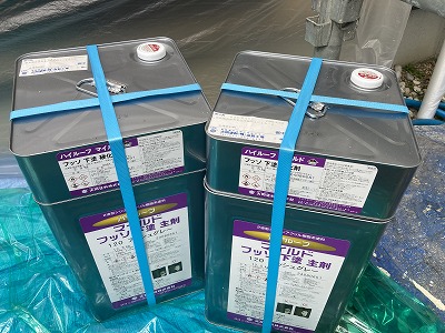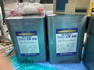 株式会社ダイフレックスのフッ素マイルド主剤を使い塗装していきます。シーラーと同じ成分が入っているので時間短縮!フッ素マイルドはシリコンよりも耐久性・密着性がまず言って全然違います!雨風や紫外線につよいので!マイルドシリコンでもモ二エルも塗装出来ますが!フッ素マイルドの方が長持ちはします!シリコンと比べて高価ですが、弊社はマイルドシリーズは押していますね!屋根を塗装する際は剥がれクレームは一度もありません!!