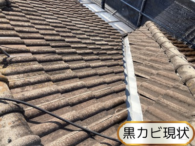 屋根のの上りモ二エル瓦を確認いたしました。黒カビがすごいですね!左の写真に関しては谷板金で左右で色が違いますよね!右はモ二エル瓦にはスラリー層と呼ばれる、コンクリートの保護する、無機質着色剤を1mm以上の厚さで塗布)によって形成される着色層のことです。スラリー層のを落とさないと塗装をしても色は乗りますが即剥がれますね!