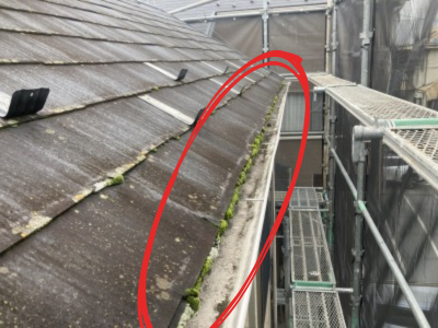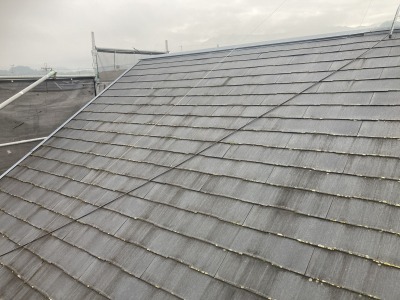 まずはスレート屋根の現状ですね!全体的にカラーベストの屋根は白華し全体にカビや苔がはえていますね!谷板金付近雨水が溜まりやすく苔が入りやすいですね!カラーベストは厚さが薄くひび割れなどが起こりやすいです!僕も現場調査に行きますが、屋根を上り確認致しますが、かなりのお家は割れや屋根全体が黒カビなどで覆われてるお家が多いですね!放置をしていたらかなり危険なので業者に点検してもらうことをおすすめいたします!
