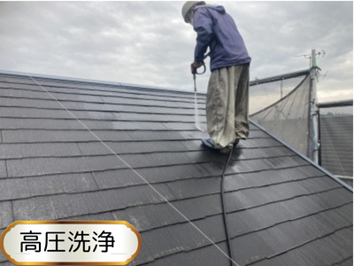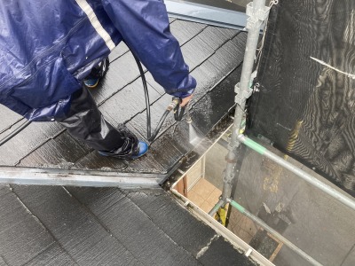 高圧洗浄をしていきます!全体に屋根に洗浄苔やカビやなどの汚れを落としていきます!特に雨樋は苔など汚れが一定に集まっているので洗浄を綺麗にする必要があるます!ここで汚れなどが落ちていない可能性もあるので、3,4週繰り返し目視で確認しながらやっていきます!