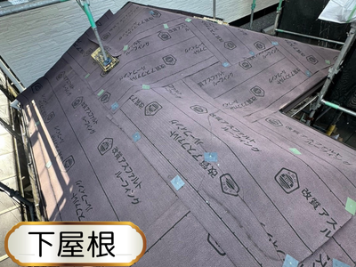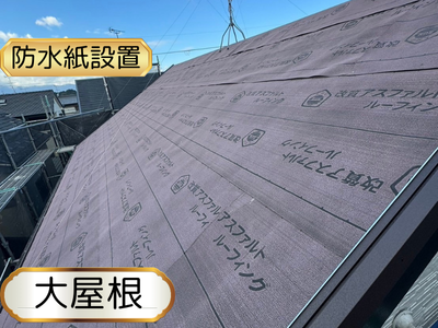高圧洗浄が完了した後、防水紙(改質アスファルトルーフィング)柔軟性・耐久性が高く、長寿命な素材です!ロール型の形になっており隙間なくカッターで切り