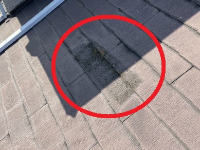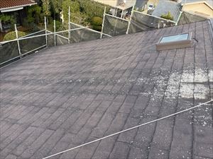 屋根全体を確認いたしました!全体にカビや色褪せなど白い経年劣化した塗膜が紫外線や雨風により粉状に分解されたものです。