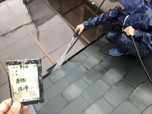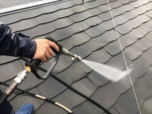 まず初めにコケなど汚れを落としていきます!高圧洗浄はやり方があります!知らない業者は上から下に洗浄していきます!ではなく!下から上に洗浄していきます!汚れを見落としなく洗浄できるので