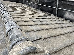 まずは瓦屋根の状態を見ていきましょう!!!これはセメント瓦になりますね!!耐久性が高いのですが!!デメリットがあります!セメントが主な材料元になっております!!ですので紫外線など雨風による!!