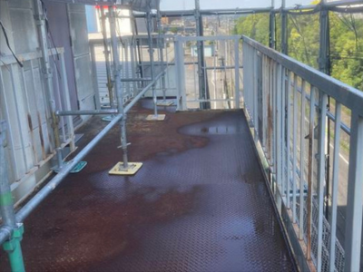 階段通路全体に赤サビが進行し、腐食が進んでいました。床が鉄板製で、雨水が溜まっていました。