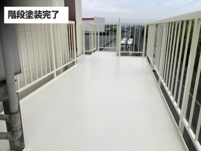 光沢も出て、安心して歩ける階段通路に生まれ変わりました。施工前は錆が広がり、水たまりも目立っていましたが、今はしっかり防錆処理&2回塗装で、耐久性も見た目もバッチリです。